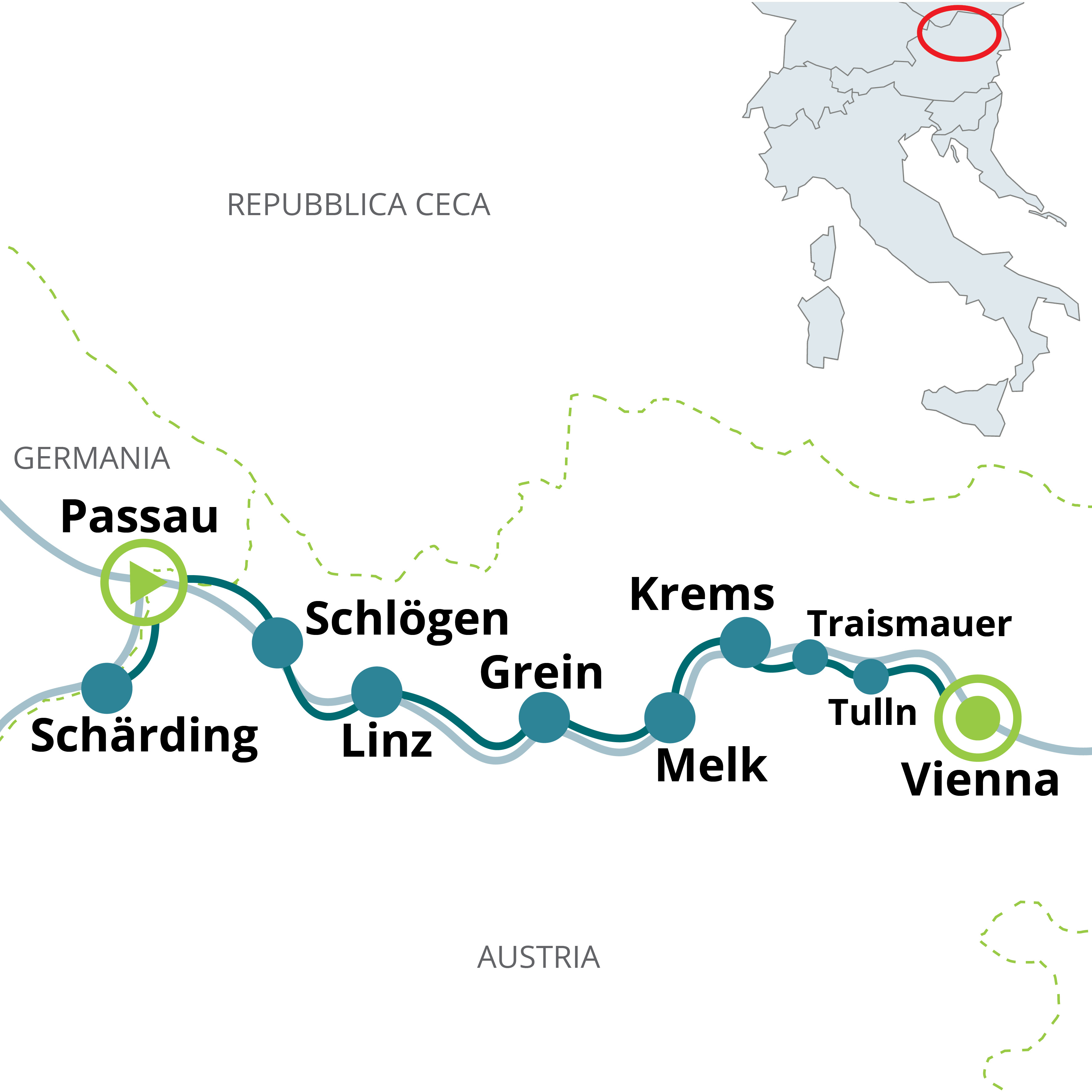 Partendo dalla città barocca di Schärding o da Passau, la città dei tre fiumi, seguirete le anse del fiume nel fiabesco paesaggio dello Strudengau e poi della Wachau prima di arrivare nella cosmopolita