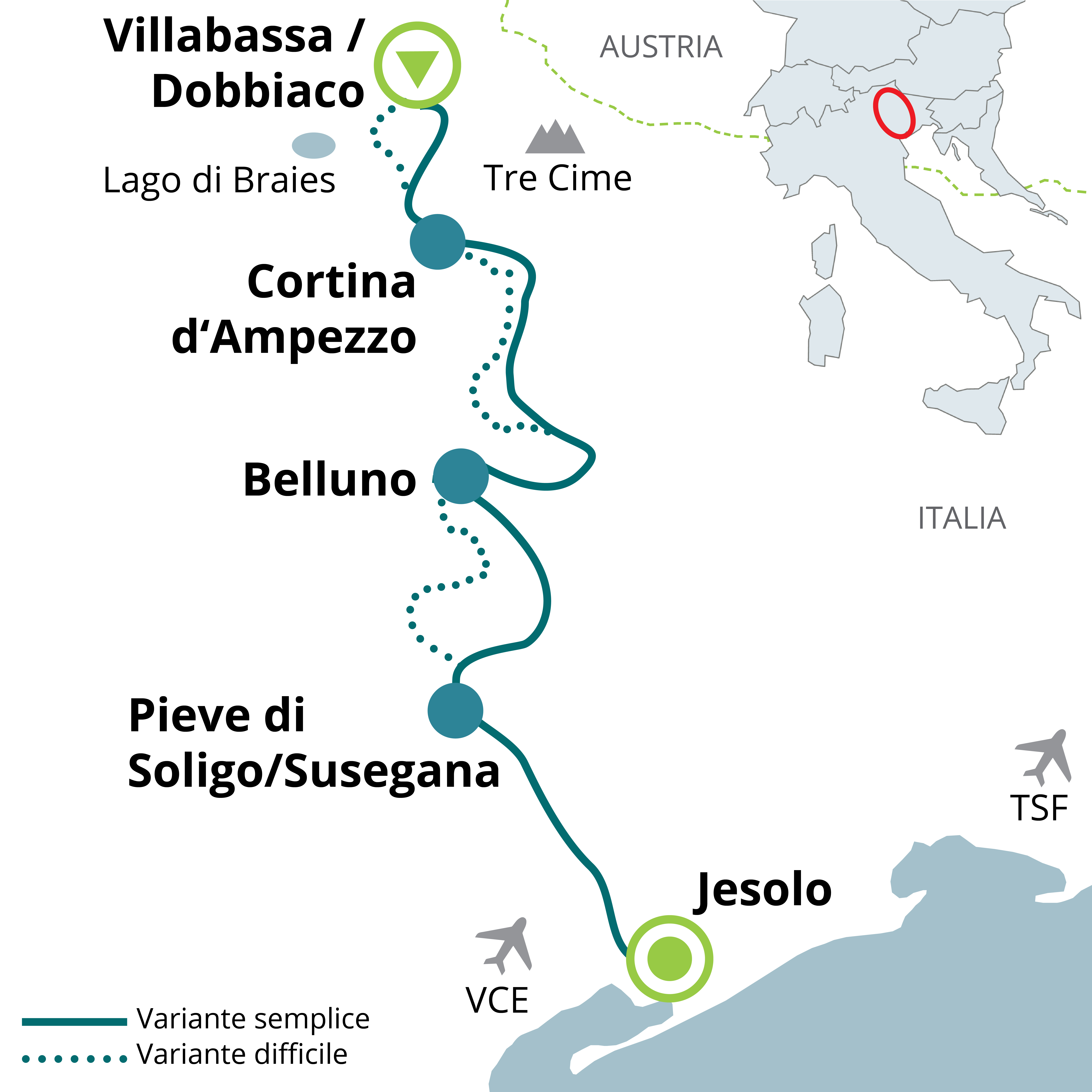 Questa tappa prevede un‘unica variante. Si pedala lungo il fiume Piave, lasciandosi ormai alle spalle le montagne. Il percorso continua verso Nervesa della Battaglia e la riserva naturale del Montello, per poi proseguire verso Noventa di Piave. Questa cittadine è molto apprezzata dai ciclisti per una sosta, grazie ai numerosi outlet di moda e sport. Proseguendo, si raggiungono le spiagge della laguna veneta, passando per Eraclea. Qui si trova una delle pinete più estese della costa adriatica. Eraclea Mare è famosa per la sua spiaggia piatta e sabbiosa, impreziosita da suggestive dune. La tappa si conclude a Jesolo, una delle località più pittoresche del Veneto orientale.