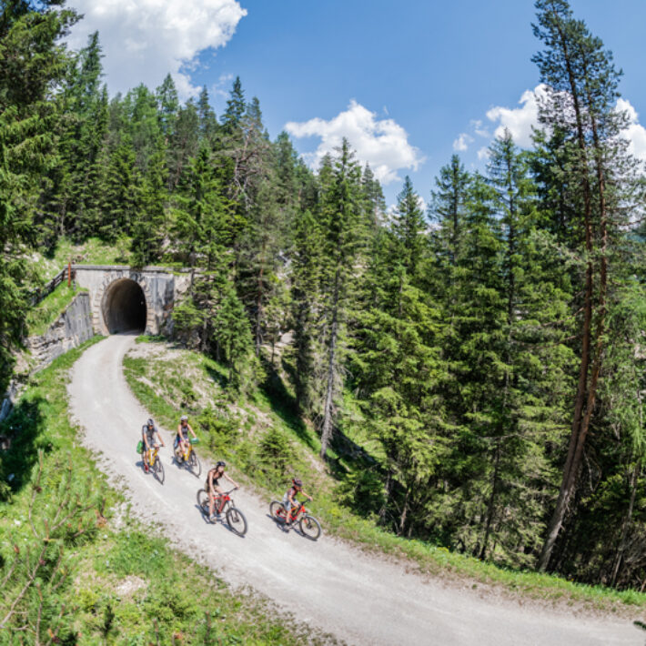 La variante più impegnativa porta prima nella Valle di Braies, da dove è possibile fare una deviazione versol‘idilliaco Lago di Braies. Successivamente si raggiunge l‘altopiano di Prato Piazza, con il Dürrenstein e l‘Hohe Gaisl che svettano maestosi. Il percorso scende poi lungo la vecchia strada militare nella valle dell‘Höhlenstein e lungo la “Ferrovia delle Dolomiti” attraverso il Passo Cimabanche fino alla città olimpica di Cortina d‘Ampezzo. La variante più facile conduce direttamente lungo il tracciato ferroviario attraverso la Valle dell‘Höhlenstein fino a Cortina d‘Ampezzo.