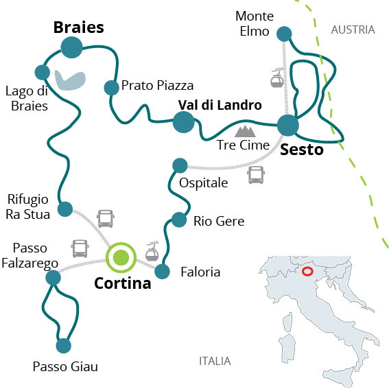 In auto: prendere l’autostrada del Brennero (A22) fino a Bressanone – uscita “Bressanone/Val Pusteria”, poi proseguire lungo la Val Pusteria (SS49) fino a Dobbiaco, quindi continuare verso sud in direzione Cortina. In alternativa, si può percorrere la strada del Felbertauern fino a Lienz in Osttirol (Austria), e poi entrare in Italia attraverso la Val Pusteria fino a Dobbiaco, proseguendo poi verso sud fino a Cortina.