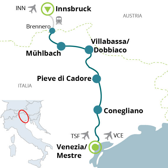 Tour in bici molto vario. Il tratto più impegnativo del passaggio sulle Alpi (Innsbruck – Brennero) viene effettuato in treno o autobus; nella tappa delle Dolomiti da Dobbiaco a Cortina d’Ampezzo si pedala seguendo la pista ciclabile lungo il vecchio tracciato ferroviario senza grandi difficoltà. Le tappe degli ultimi due giorni, avvicinandosi al mare, sono pianeggianti. Adatto a ragazzi da 16 anni.