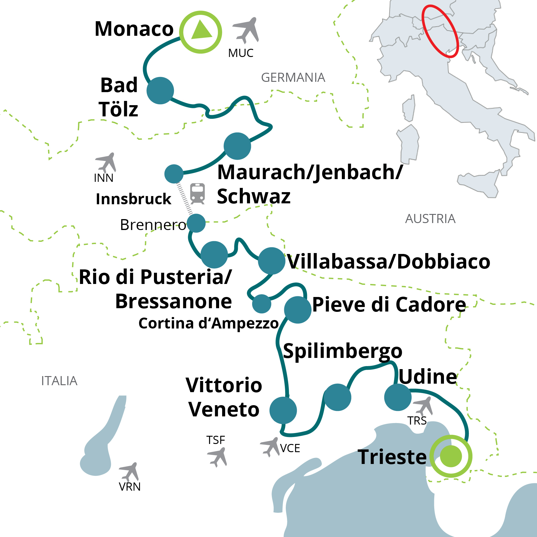 Il tour “Monaco–Trieste” unisce il piacere della bicicletta a un’esperienza davvero unica: attraversare le Alpi partendo dalla Germania, passando per l’Austria, fino a raggiungere l’Italia e il Mar Adriatico. L’itinerario si sviluppa lungo piste ciclabili ben curate, tracciati segnalati e tranquille strade secondarie, offrendo ai ciclisti l’occasione di scoprire tre Paesi diversi, ciascuno con le proprie regioni turistiche, oltre a numerosi e affascinanti tesori naturali e culturali. Da Monaco di Baviera, città affacciata sull’Isar, il percorso si snoda tra i laghi bavaresi e lungo suggestivi corsi d’acqua, attraversa spettacolari paesaggi alpini, per poi proseguire verso il Friuli Venezia Giulia, fino a raggiungere Trieste, elegante città di mare, dove storia, cultura e atmosfera mitteleuropea si fondono in modo unico.