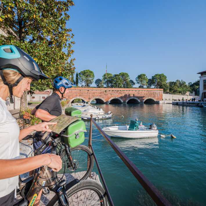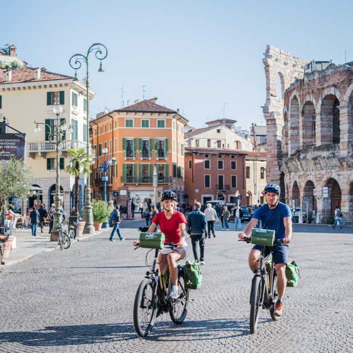 Durante la prima tappa in bici seguirete il corso dell‘Adige verso la vivace e laboriosa Verona, l‘elegante e romantica città di Romeo & Giulietta. Il centro storico con l‘Arena romana, i palazzi e gli antici vicoli è dal 2000 parte del Patrimonio Mondiale UNESCO, un luogo pieno di storia, cultura, architettura e joie de vivre. Pedalando tra le colline della regione meridionale del lago di Garda farete ritorno a Bussolengo passando per Sommacampagna.