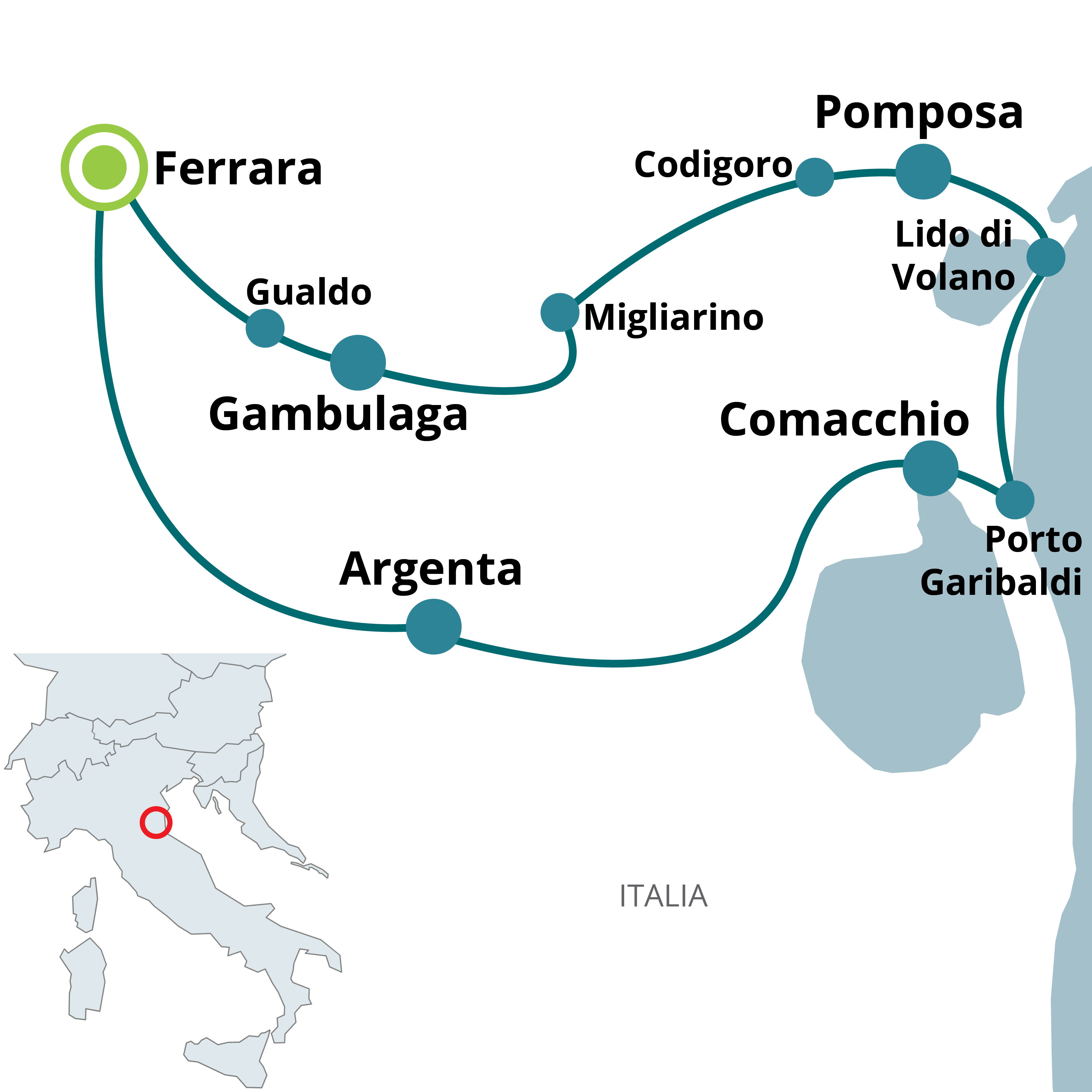 La giornata inizierà esplorando l e v ie s trette e i b ellissimi g iardini interni che caratterizzano molte abitazioni ed edifici storici di questa città. Nei vari periodi dell‘anno Ferrara offre anche molte iniziative culturali, rassegne artistiche e musicali e diverse rievocazioni storiche come il suggestivo Palio nell‘ultima domenica di maggio (durante tutto il mese di maggio nella Piazzetta municipale si potrà assistere alle prove degli sbandieratori delle contrade). Uscendo dalla città seguirete la pista ciclabile in direzione di Gambulaga e presto incontrerete la Basilica di San Giorgio Fuori le mura, la chiesa più antica della città; pedalando attraverso campagne coltivate arriverete a Voghenza, in epoca estense importante centro sulla riva di un antico alveo del fiume Po, soppiantata da Voghiera in seguito alla costruzione della Delizia di Belriguardo sull’altra sponda del Po. Qui potrete visitare la Tomba di San Leo all’interno della Chiesa e al Museo del Modellismo. Superata Voghiera è da vedere la Delizia di Belriguardo, considerata la Versaille dell’epoca, e il suo Museo archeologico.