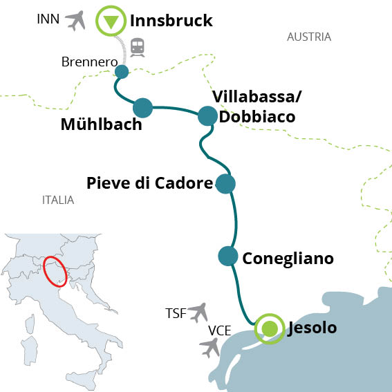 Tour in bici molto vario. Il tratto più impegnativo del passaggio sulle Alpi (Innsbruck – Brennero) viene effettuato in treno o autobus; nella tappa delle Dolomiti da Dobbiaco a Cortina d’Ampezzo si pedala seguendo la pista ciclabile lungo il vecchio tracciato ferroviario senza grandi difficoltà. Le tappe degli ultimi due giorni, avvicinandosi al mare, sono pianeggianti. Adatto a ragazzi da 16 anni. Se non è stato raggiunto il numero minimo di partecipanti, ci riserviamo il diritto di cancellare il viaggio fino a quattro settimane prima della “data di arrivo”. Si consiglia di organizzare il viaggio da e per la destinazione solo dopo questo termine.