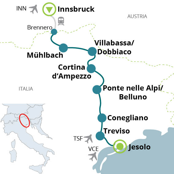 Tour in bici molto vario. Il tratto più impegnativo del passaggio sulle Alpi (Innsbruck – Brennero) viene effettuato in treno o autobus; nella tappa delle Dolomiti da Dobbiaco a Cortina d’Ampezzo si pedala seguendo la pista ciclabile lungo il vecchio tracciato ferroviario senza grandi difficoltà. Le tappe degli ultimi due giorni, avvicinandosi al mare, sono pianeggianti. Adatto a ragazzi da 16 anni. Se non è stato raggiunto il numero minimo di partecipanti, ci riserviamo il diritto di cancellare il viaggio fino a quattro settimane prima della “data di arrivo”. Si consiglia di organizzare il viaggio da e per la destinazione solo dopo questo termine.
