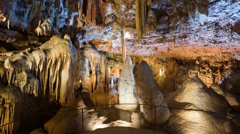 L'interno della grotta è riccamente decorato con depositi di calcite, stalattiti, stalagmiti e colonne coniche.