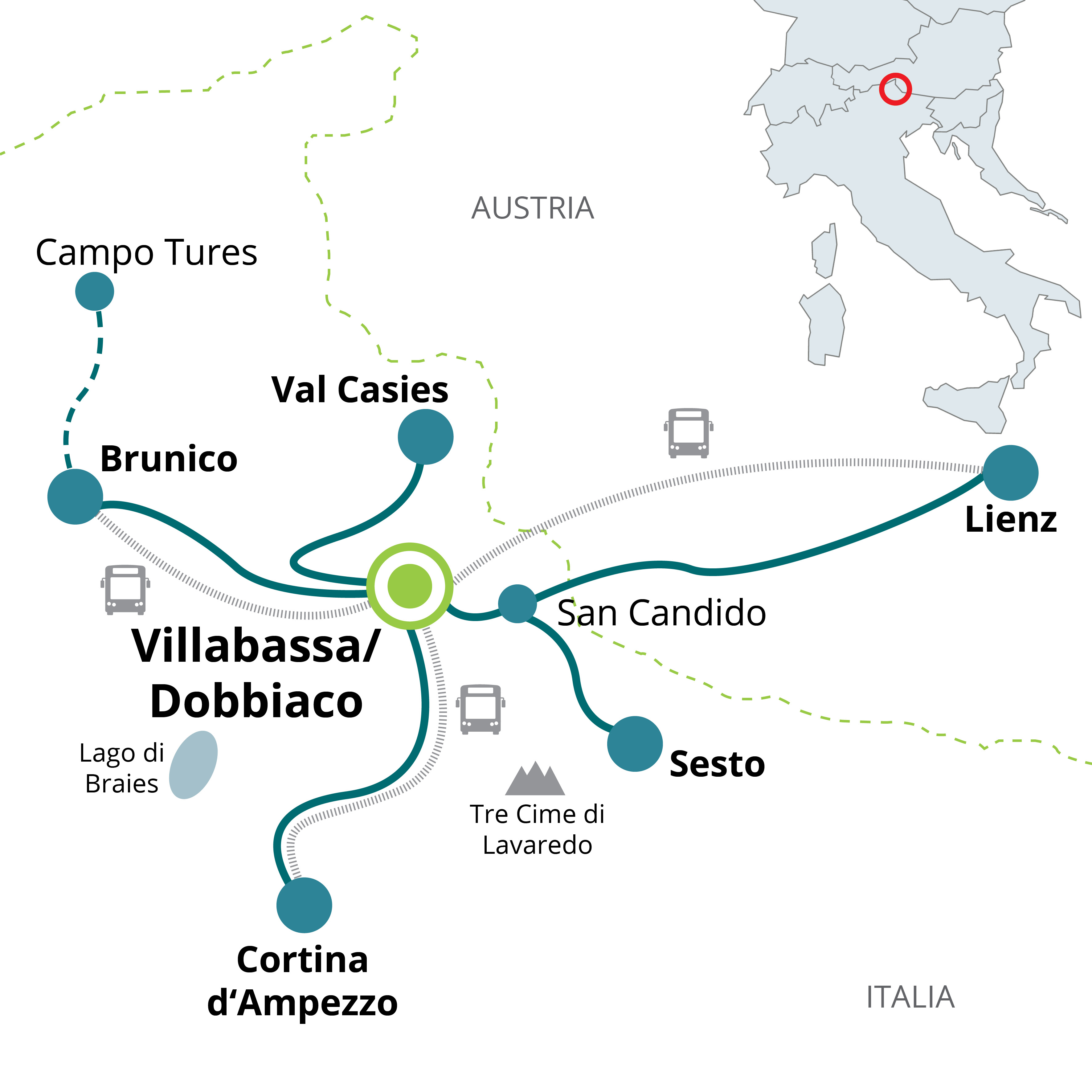 Ogni giorno partirete dal vostro hotel a Dobbiaco o Villabassa per effettuare l‘escursione circolare in bici seguendo le piste ciclabili ai piedi delle Dolomiti; pedalerete lungo le valli collaterali di Sesto e Val Casies e lungo il tracciato della vecchia ferrovia fino a Cortina d’Ampezzo; il divertimento è garantito per tutti, sia per i più atletici che per chi desidera pedalare in tutta tranquillità e naturalmente anche per i vostri bimbi! Il pernottamento è previsto sempre nello stesso hotel in Alta Pusteria (Dobbiaco/Villabassa) da dove si inizia ogni giorno l‘escursione in bici; non sarà quindi necessario rifare le valigie ogni giorno per spostarsi da una località all‘altra… e se un giorno non avrete voglia di pedalare potrete scegliere di rimanere comodamente in hotel o dedicarvi ad una altra attività.