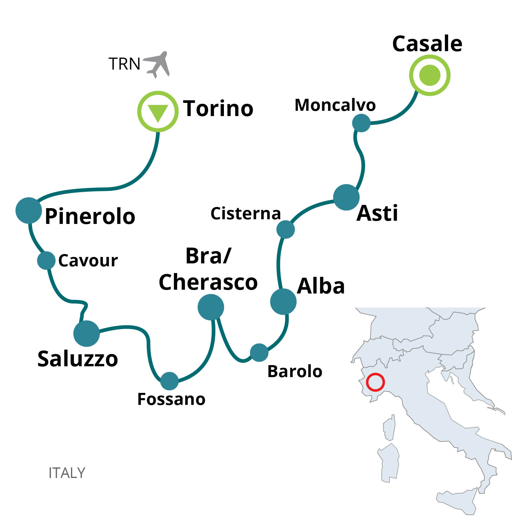 Il Piemonte è eleganza e stile, lo si vede innanzitutto scoprendo il suo capoluogo, Torino, prima capitale italiana dove l’influenza dello stile francese è molto evidente, tanto da essere chiamata anche “piccola Parigi”. La stessa sorpresa si ha arrivando nelle piccole cittadine di Pinerolo e Saluzzo con il loro charme medievale; quindi le Langhe con Bra e Alba, regni dell’enogastronomia: non mancate il piacere di una deliziosa cena a base di indimenticabili piatti accompagnati da nobili vini langaroli come il Barolo o il Barbaresco. Percorrendo le colline del Roero e del Monferrato si arriva infine a Casale, tranquilla cittadina in riva al Po. Scoprire il Piemonte in bicicletta sarà una esperienza davvero unica! Prima parte del percorso facile, medio/facile la seconda parte; si seguono ciclopiste e strade a basso traffico; alcune strade sterrate in buone condizioni; pianeggiante da Torino a Fossano; alcuni leggeri dislivelli nelle Langhe fino a Barolo e nel Monferrato da Alba a Casale.