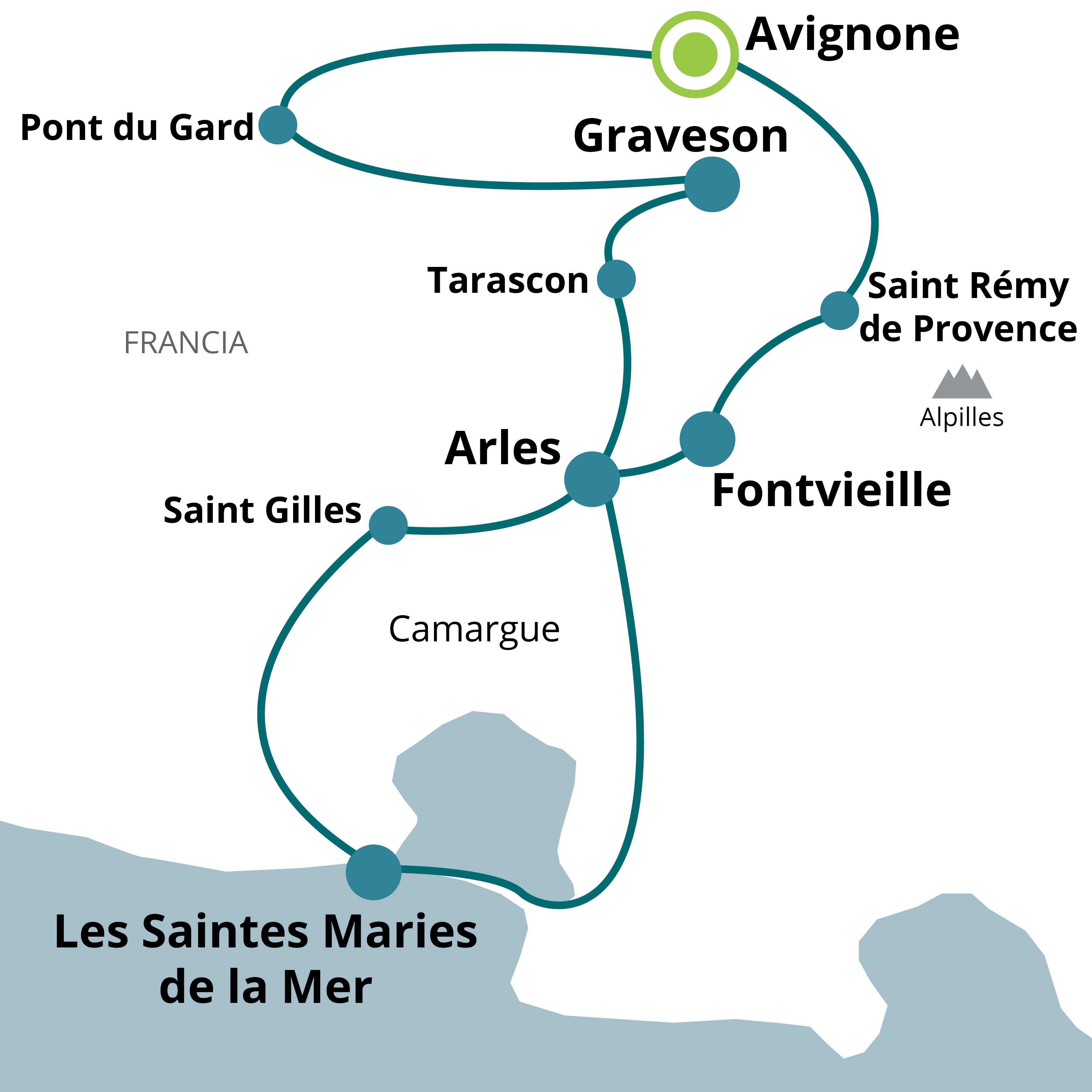 La catena delle “Alpilles” poi, con i suoi famosi villaggi arroccati, ci rimanderà ai paesaggi della lontana Grecia con i suoi cipressi ed ulivi. I vigneti del “Gard” vi indicheranno la via per raggiungere lo splendido acquedotto romano di „Pont du Gard“ e poi Avignone, la Città dei Papi, con il suo intricato labirinto di vicoli e viuzze. Ogni villaggio che attraverserete, ogni sagra, ogni inaspettato incontro, vi svelerà la vera Provenza, quella che non avreste mai potuto scoprire in altro modo se non immergendovi nella cultura provenzale!