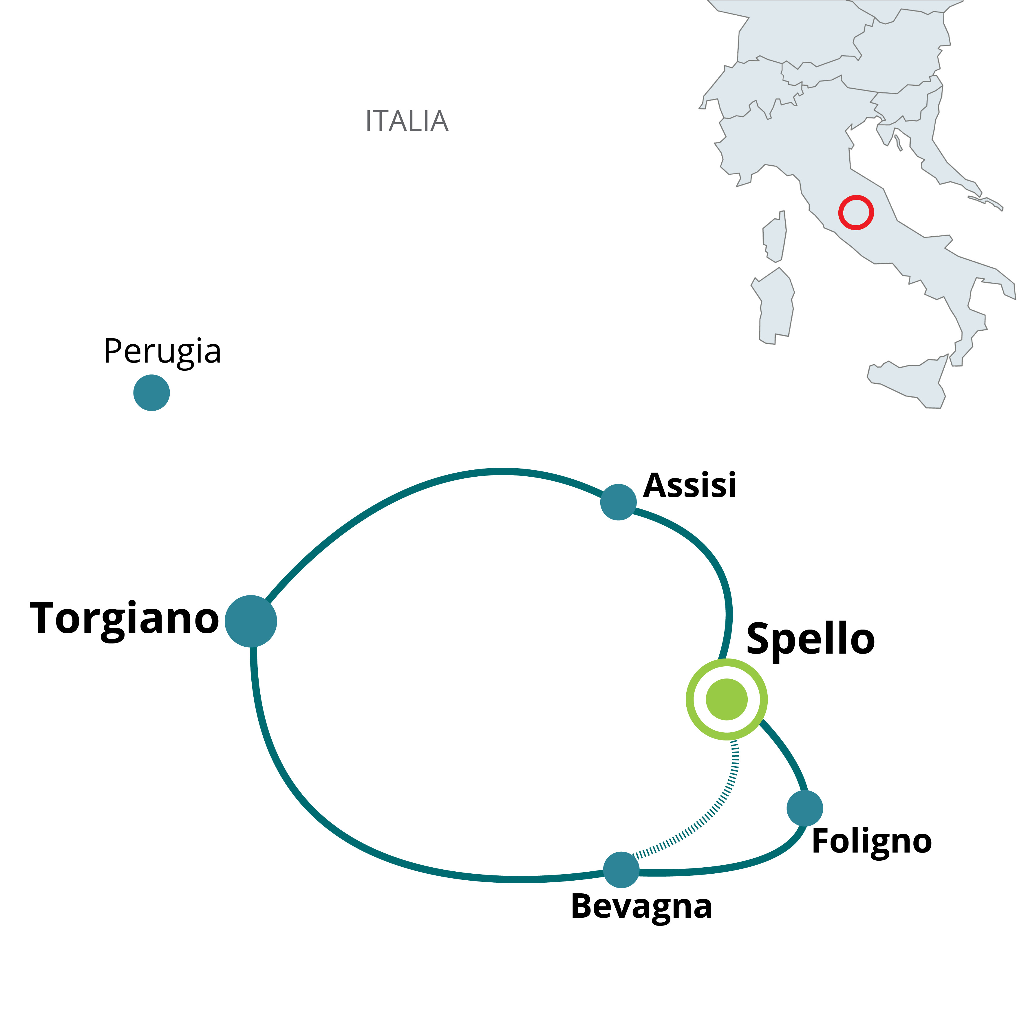 Stamattina potrete dedicare ancora un po‘ di tempo alla visita di Spello prima di proseguire attraverso la pressochè pianeggiante Valle Umbra e raggiungere prima Bevagna, città di origine Romana e poi con una ultima breve pedalata Torgiano. In età medievale Torgiano era un borgo fortificato; oggi è un paese tranquillo posto su una collina alla confluenza del Chiascio con il Tevere. Le fertili colline circostanti sono ideali per la coltura della vite e dell’olivo. In questa zona troviamo le vigne del Rosso Riserva d.o.c.g.