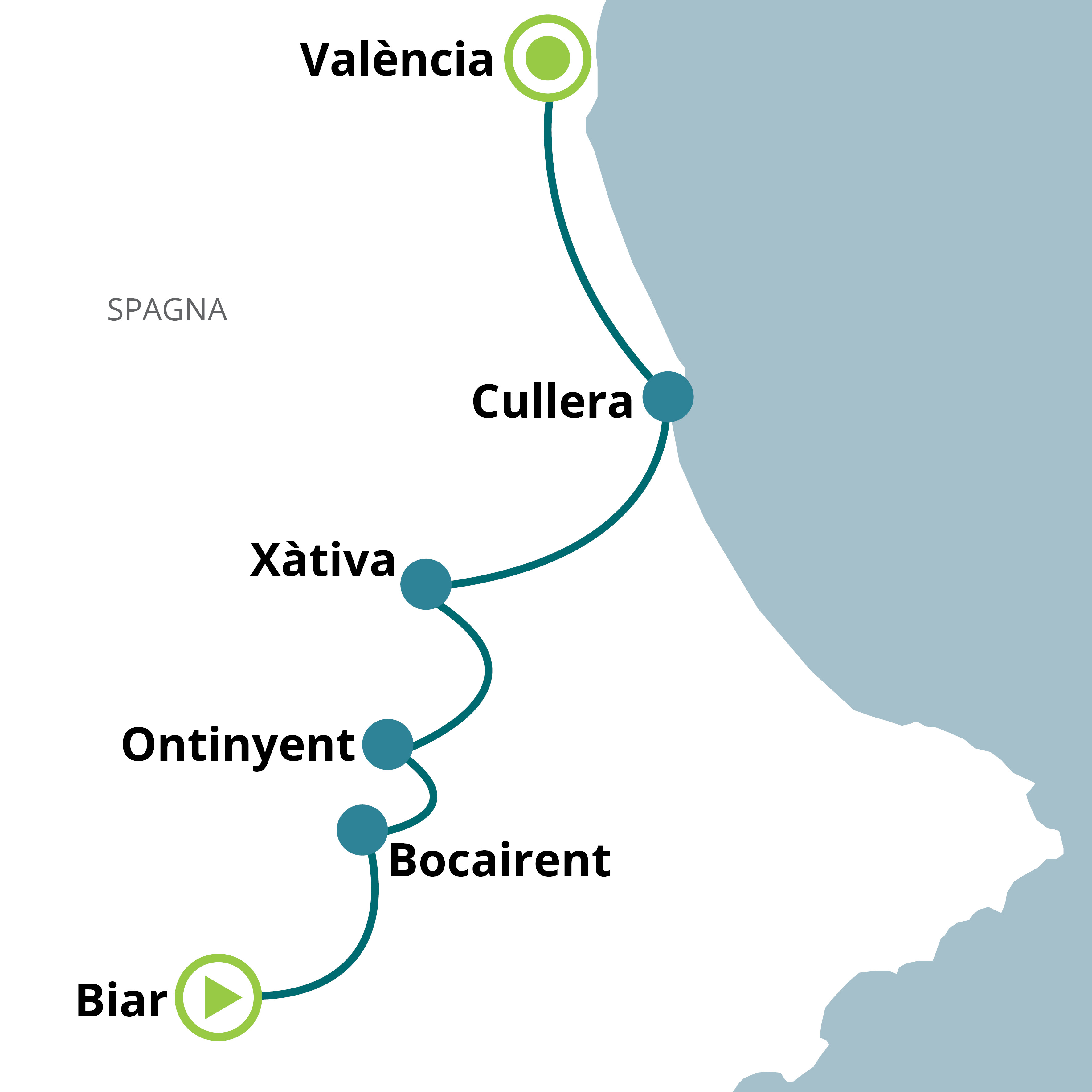 Inizierete questa tappa pedalando fra campi dal verde brillante, mandorli, ulivi e alberi di albicocche, non mancano nemmeno piantagioni di cachi e antichi vigneti. Si entra poi nella cittadina di Ontinyent nota per l’interessante e imponente palazzo fortificato. Nel procedere verso la diga Bellús incontrerete poi piccoli paesi e borghi; la zona intorno alla diga è di grande valore paesaggistico ed ecologico. Potrete ammirare alcune costruzioni di valore architettonico come i vecchi mulini, gli “azuts” (dighe per controllare le acque) e delle infrastrutture per l‘irrigazione. Qui la terra è la più fertile del distretto e non a caso gli orti si trovano in abbondanza. Seguirete un sentiero che costeggia la gola del fiume Albaida (in primavera ed estate si può fare un tuffo nelle sue acque per rinfrescarsi). Ci si dirigerà poi verso la nobile città di Xàtiva, un luogo ricco di storia dominato da un imponente castello.